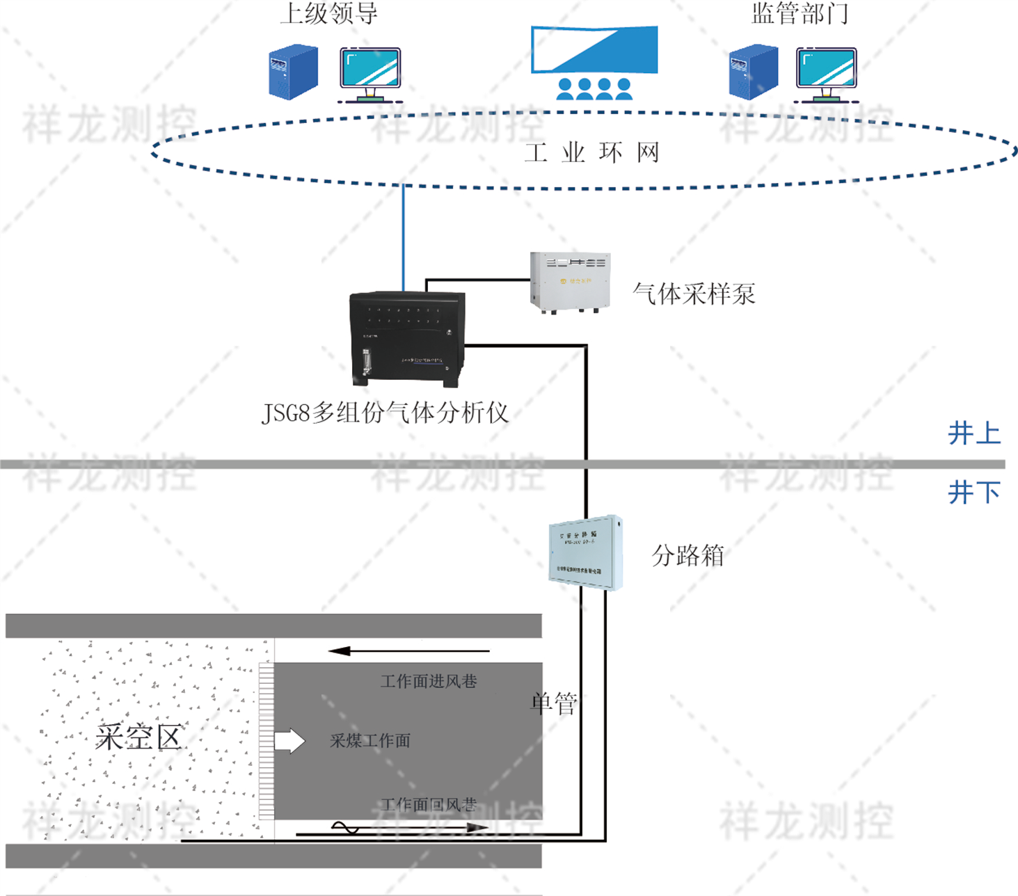 系統(tǒng)由多組份氣體分析儀、計(jì)算機(jī)、打印機(jī)、系統(tǒng)軟件、氣體采樣泵、煤礦用聚乙烯束管、束管分路箱、粉塵過濾器等組成。